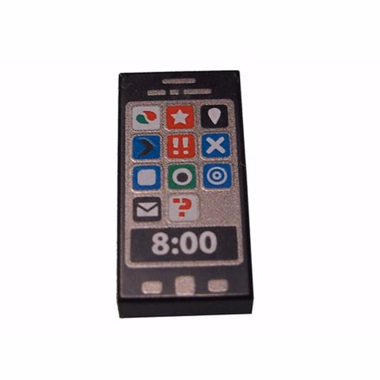 Деталь Lego 3069pb0299 Tile 1 x 2 with Cell Phone / Smartphone Octan, Star and other Icons and ‘8:00’ Pattern