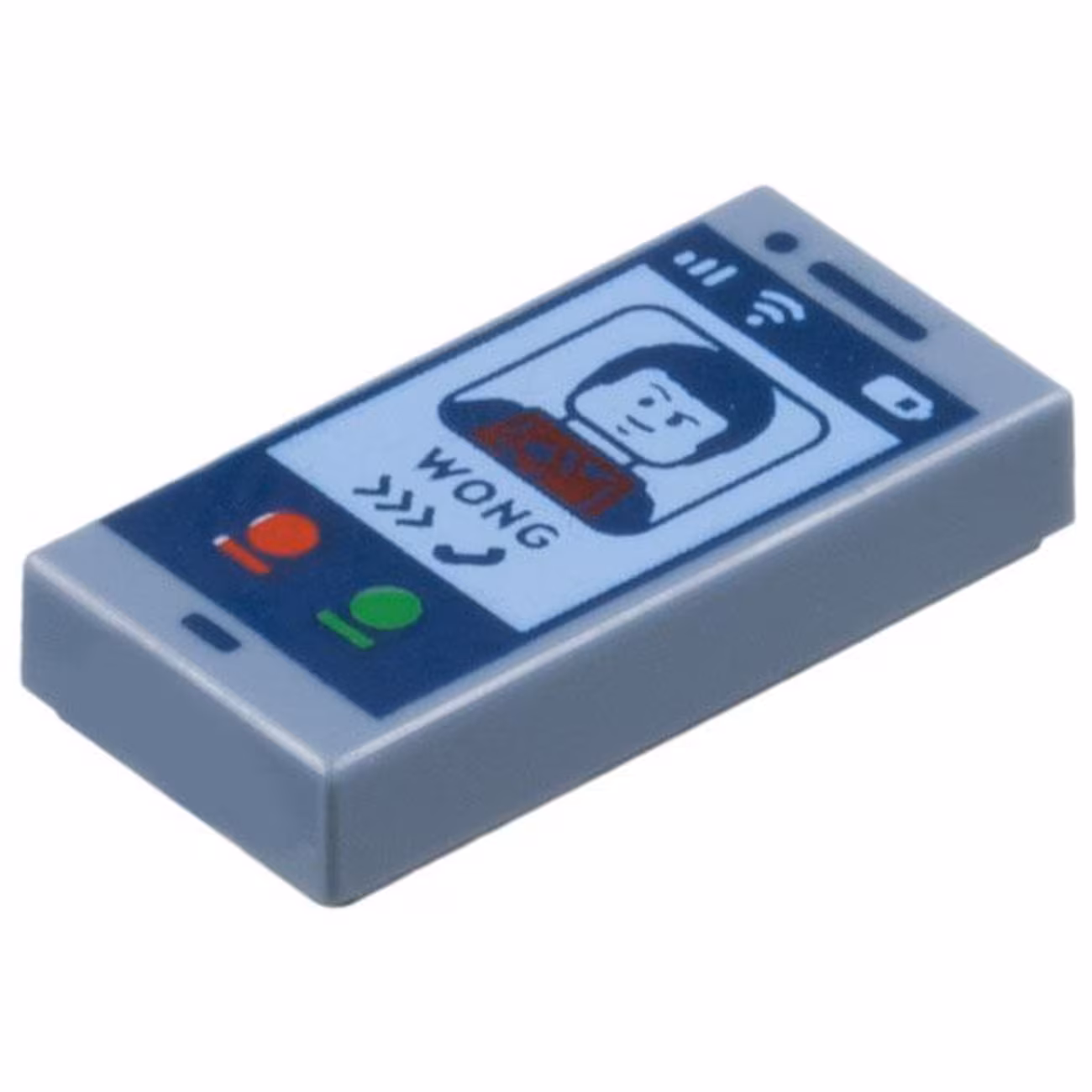 Деталь Lego 3069pb1189 Tile 1 x 2 with Cell Phone / Smartphone with Dark Blue Minifigure, ‘WONG’, Calling Symbol, and Red and Green Buttons Pattern