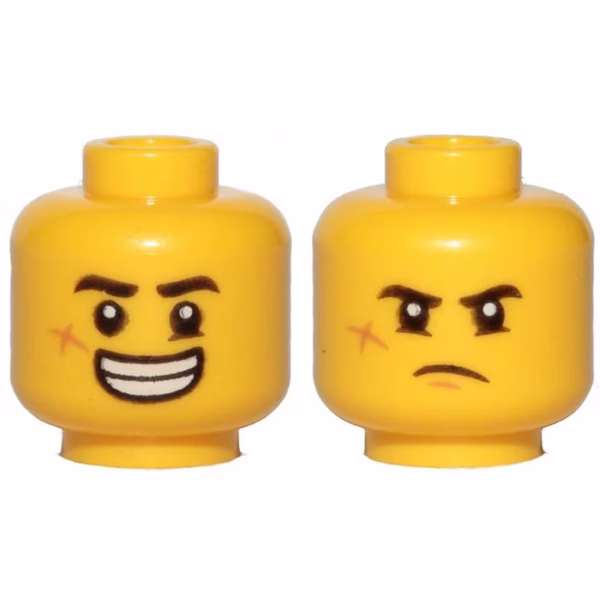 Деталь Lego 3626pb2441 Minifigure, Head Dual Sided Black Eyebrows, Cheek Scar, Large Smile with Teeth / Grumpy Pattern