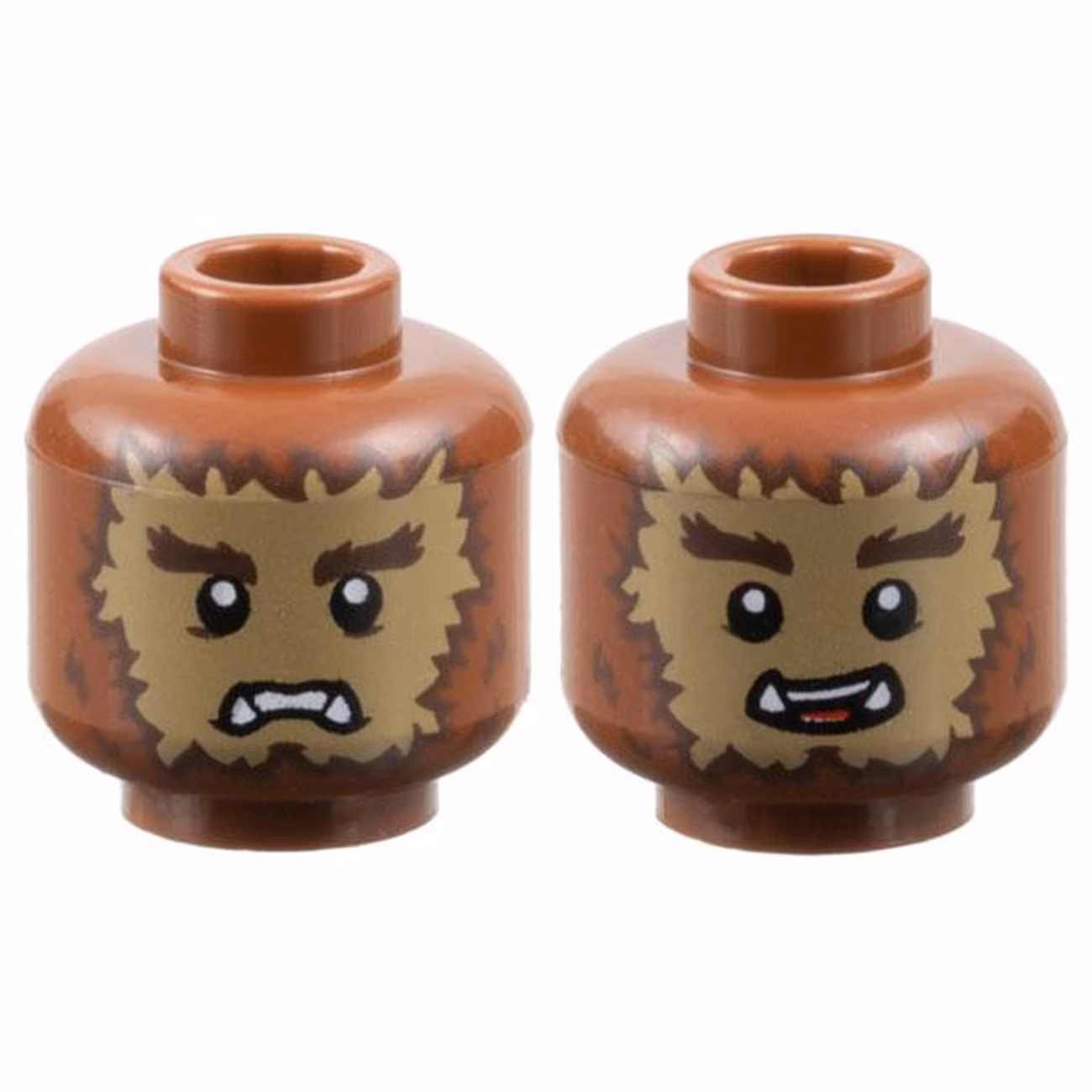Деталь Lego 3626pb3458 Minifigure, Head Dual Sided Alien Dark Brown Bushy Eyebrows and Fur, Dark Tan Face, Lower Fangs, Scowl / Open Mouth Smile with Top Teeth and Red Tongue Pattern