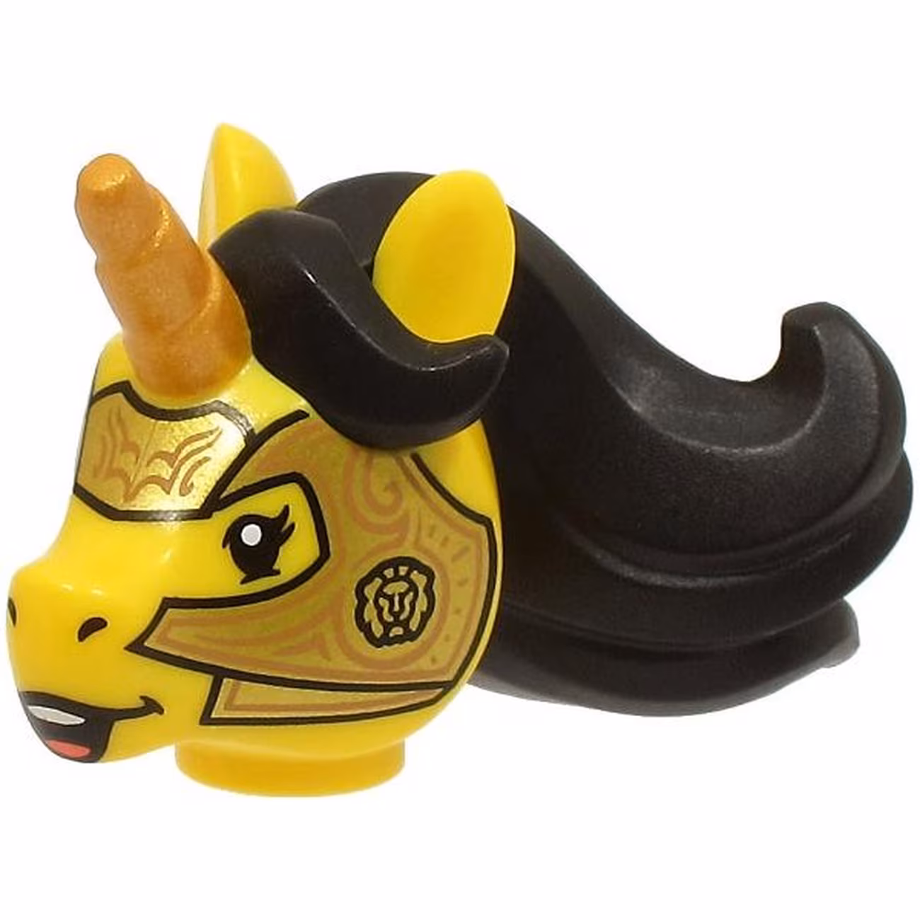 Деталь Lego 70751pb03 Minifigure, Head, Modified Unicorn with Molded Black Mane and Printed Gold Horn and Armor with Copper Lines Pattern (BAM)