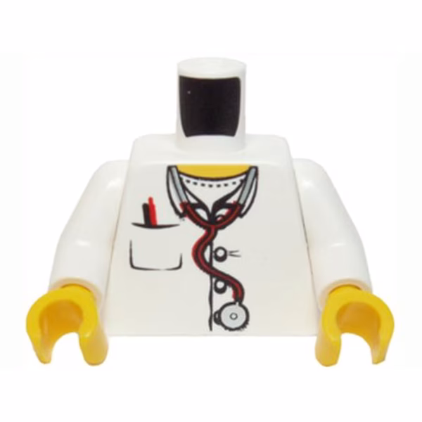 Деталь Lego 973pb0408c01 Torso Hospital Lab Coat, Open Collar, Stethoscope, Pocket Pen, and Thermometer Pattern / White Arms / Yellow Hands