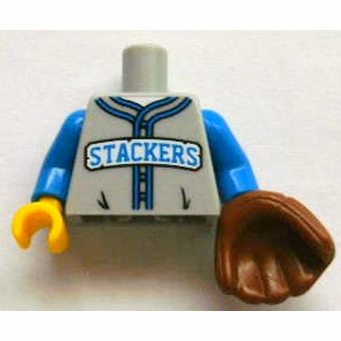 Деталь Lego 973pb1400c01 Torso Baseball Jersey with Blue Trim and ‘STACKERS’ Logo Pattern / Blue Arms / Yellow Hand Right / Reddish Brown Baseball Glove Left