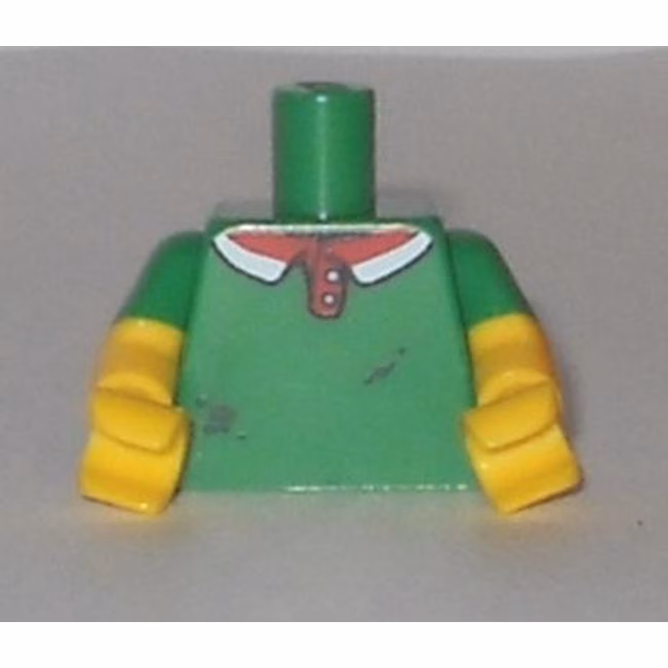Деталь Lego 973pb1771c01 Torso Polo Shirt with Red and White Collar, Pizza Sauce Stains on Front Pattern / Yellow Arms with Molded Green Short Sleeves Pattern / Yellow Hands