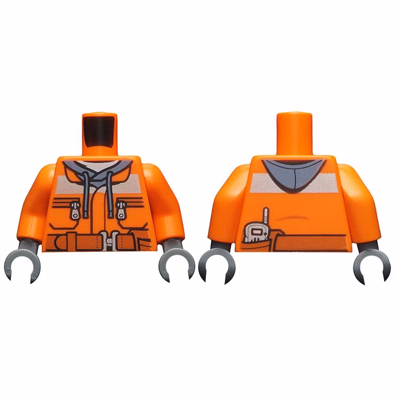 Деталь Lego 973pb1895c01 Torso Construction Jacket over Sand Blue Hoodie, Reflective Stripe, Zipper Pockets, Dark Orange Belt with Pouch and Radio Pattern / Orange Arms / Dark Bluish Gray Hands