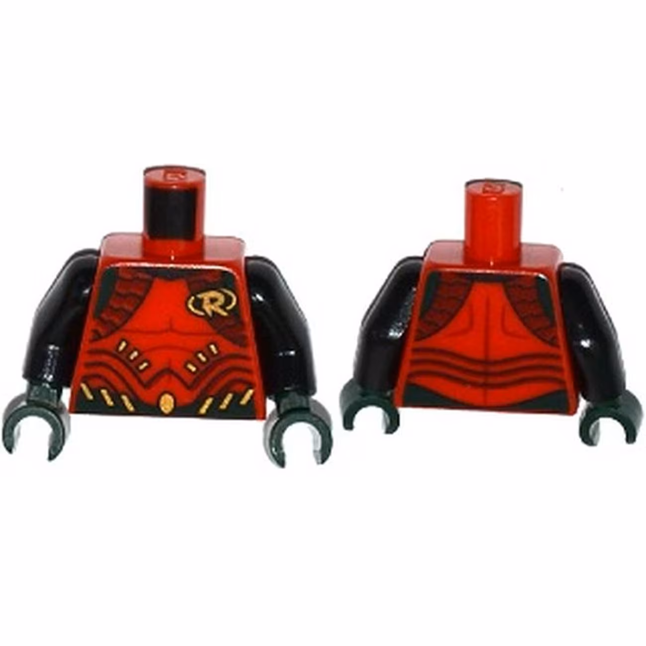 Деталь Lego 973pb2264c01 Torso Batman ‘R’ Symbol, Body Armor with Muscles Outline and Dark Green and Gold Belt Pattern / Black Arms / Dark Green Hands