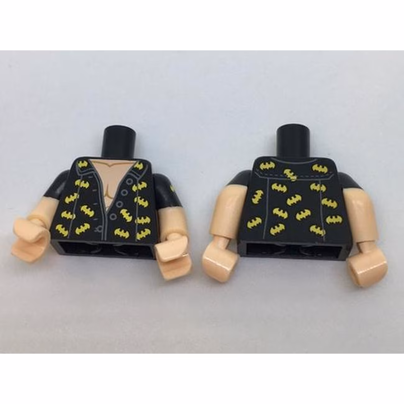 Деталь Lego 973pb2566c01 Torso Batman Open Shirt with Dark Bluish Gray Buttons, Trim and Yellow Bats Pattern / Light Nougat Arms with Black Short Sleeves / Light Nougat Hands