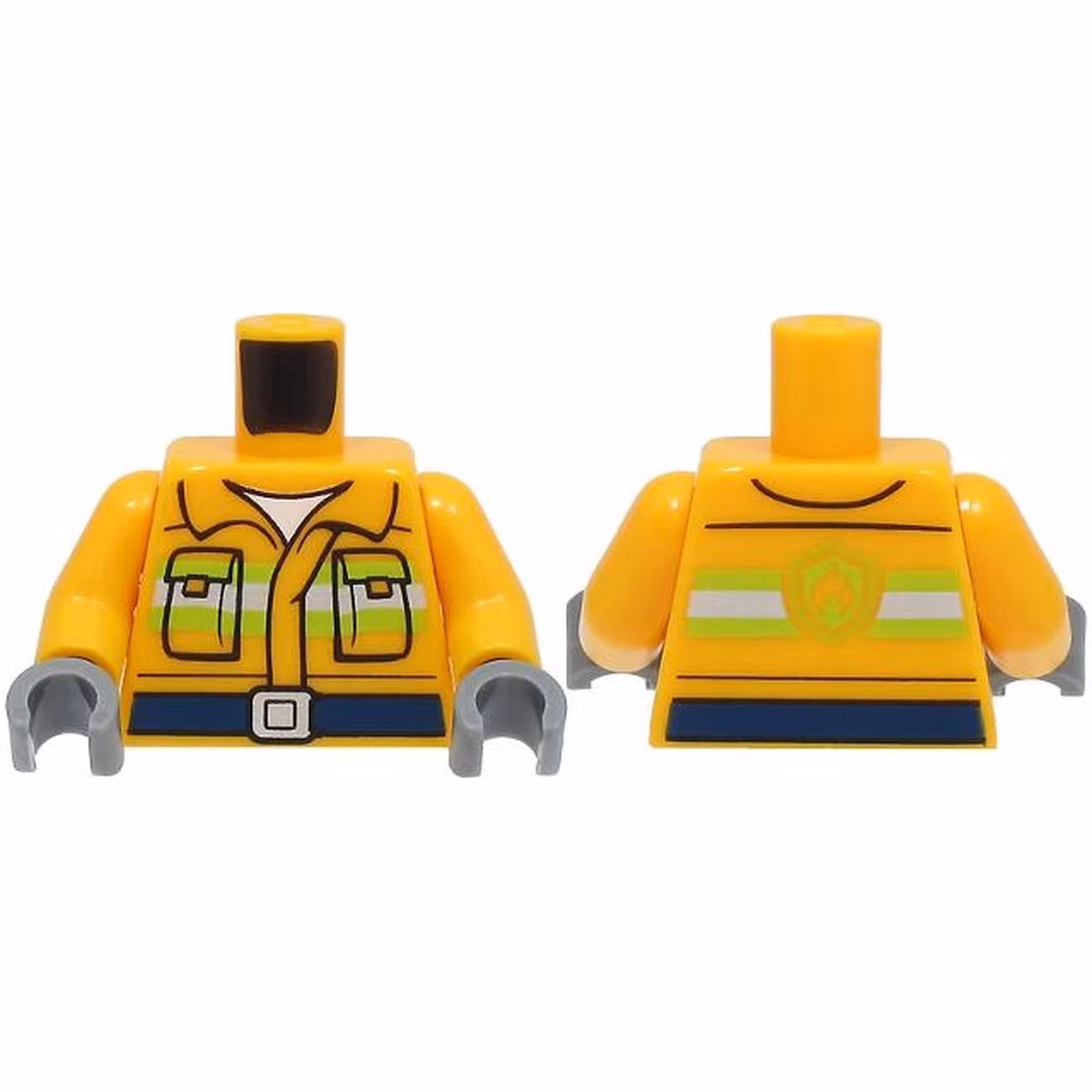 Деталь Lego 973pb3384c01 Torso Fire Reflective Stripes with Pockets, Dark Blue Belt, and Fire Logo on Back Pattern / Bright Light Orange Arms / Dark Bluish Gray Hands