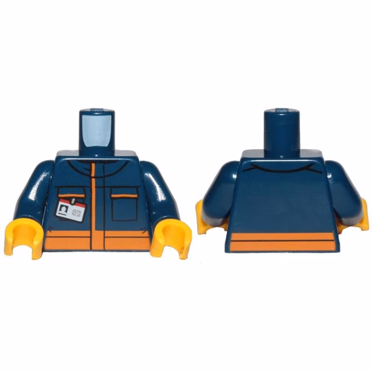 Деталь Lego 973pb3556c01 Torso Jumpsuit with Orange Stripes and White Minifigure ID Badge Pattern / Dark Blue Arms / Yellow Hands