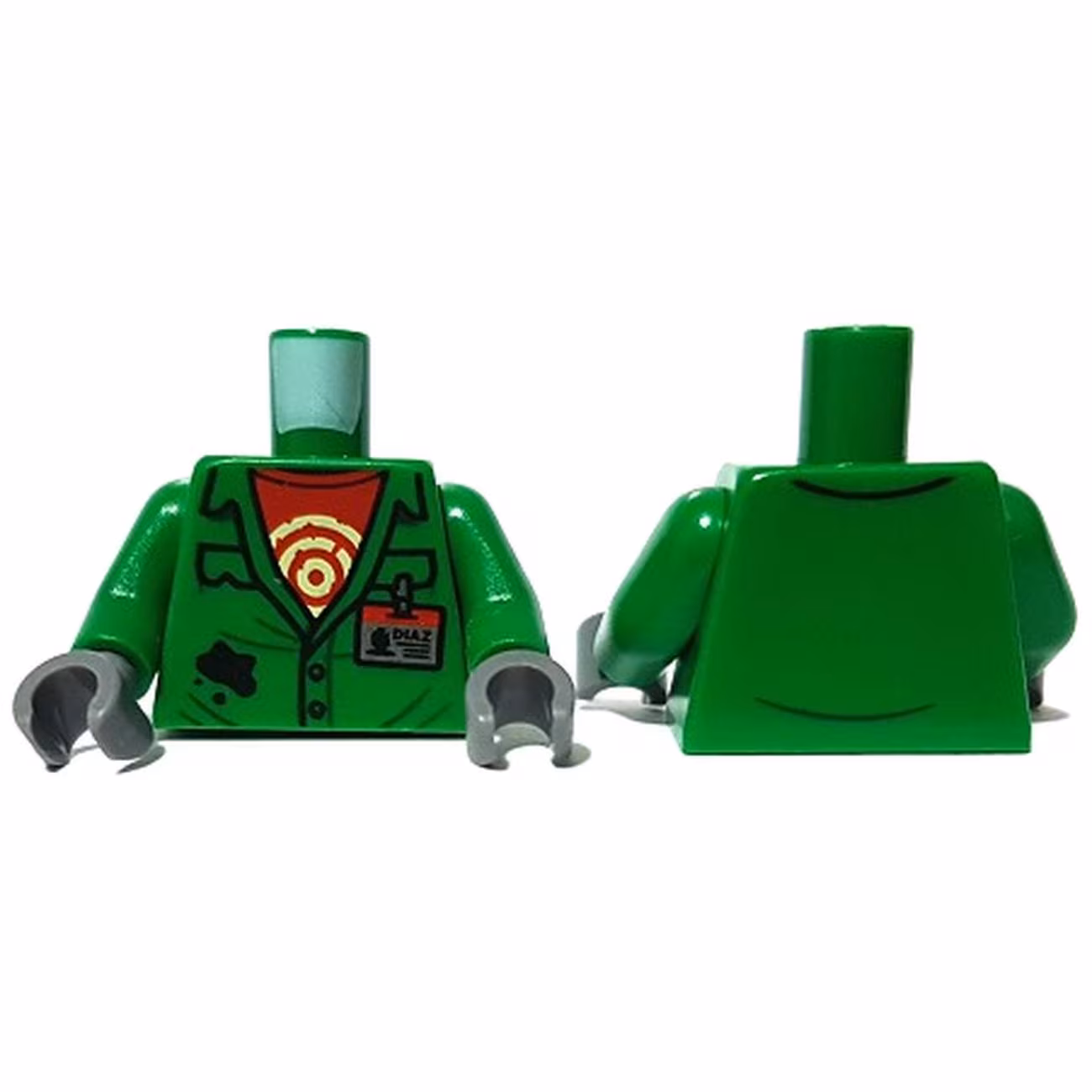 Деталь Lego 973pb3622c01 Torso Coveralls with Pockets, Red Undershirt with Circles, Silver ‘DIAZ’ ID Badge, Black Splotch Pattern / Green Arms / Dark Bluish Gray Hands