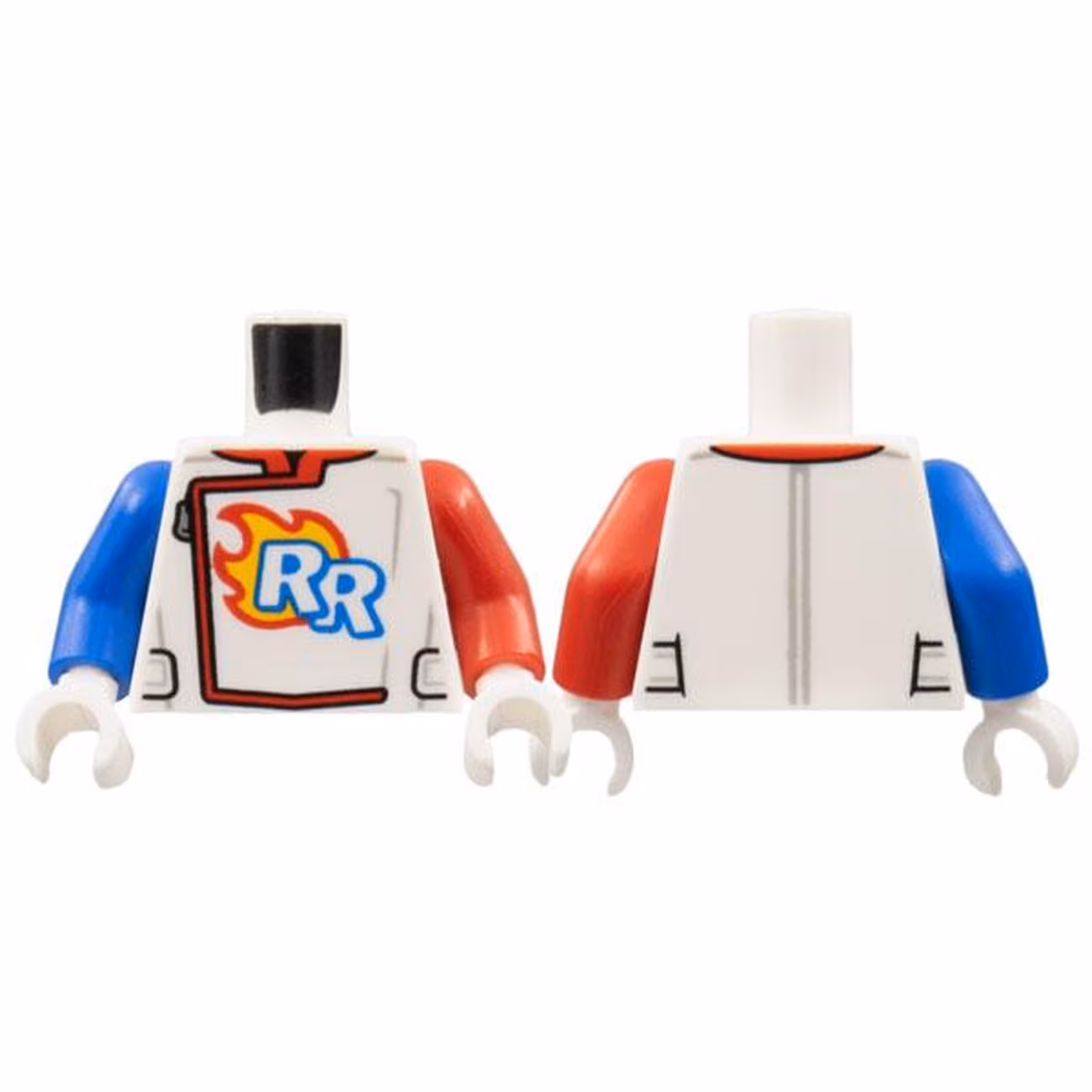 Деталь Lego 973pb4472c01 Torso Racing Suit, Zipper, ‘RR’ Logo, Flames Pattern / Red Arm Left / Blue Arm Right / White Hands