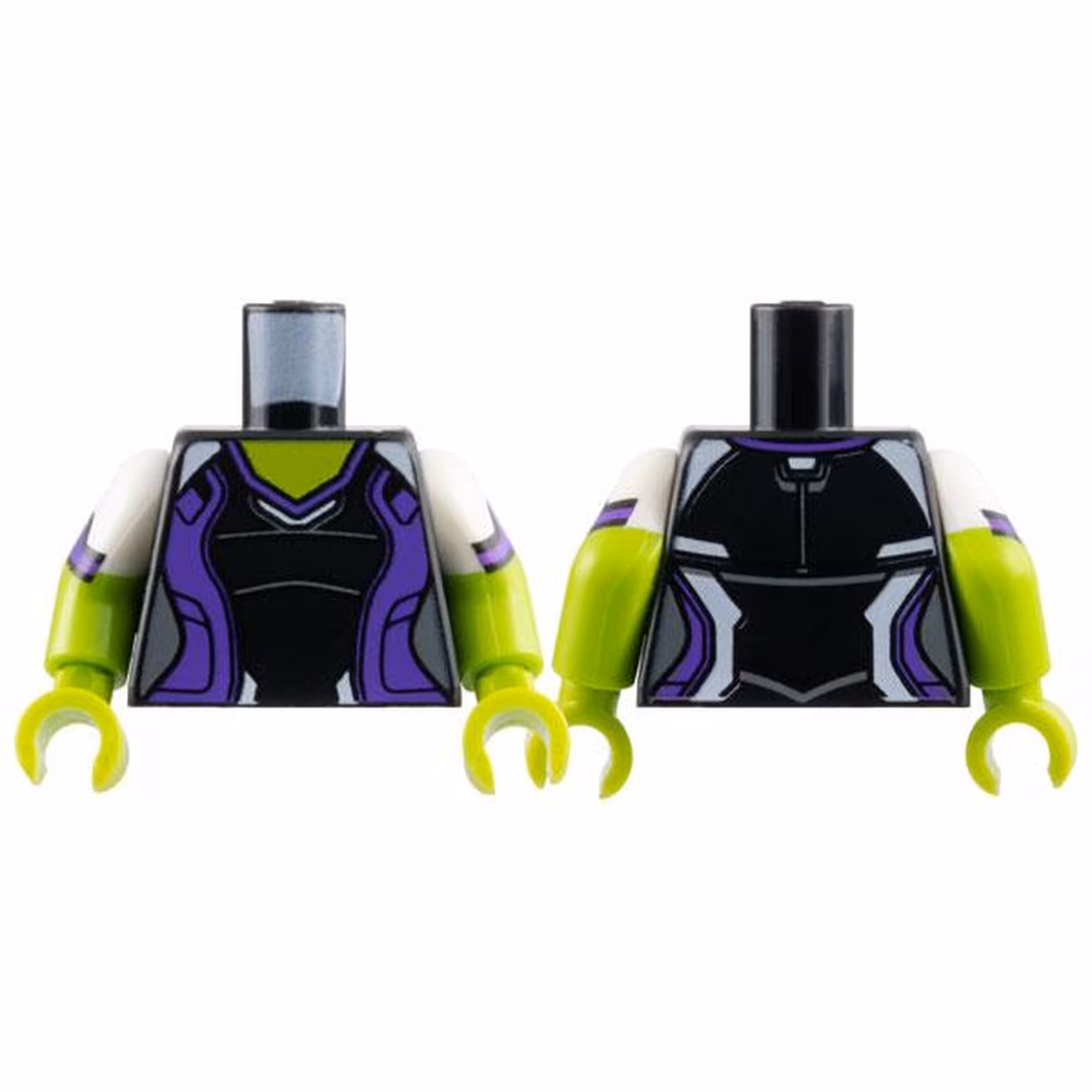 Деталь Lego 973pb5392c01 Torso Female Super Hero Costume with Dark Purple Side Panels and White Shoulders, Lime Neck Pattern / Lime Arms with Molded White Short Sleeves and Printed Black and Dark Purple Hems Pattern / Lime Hands