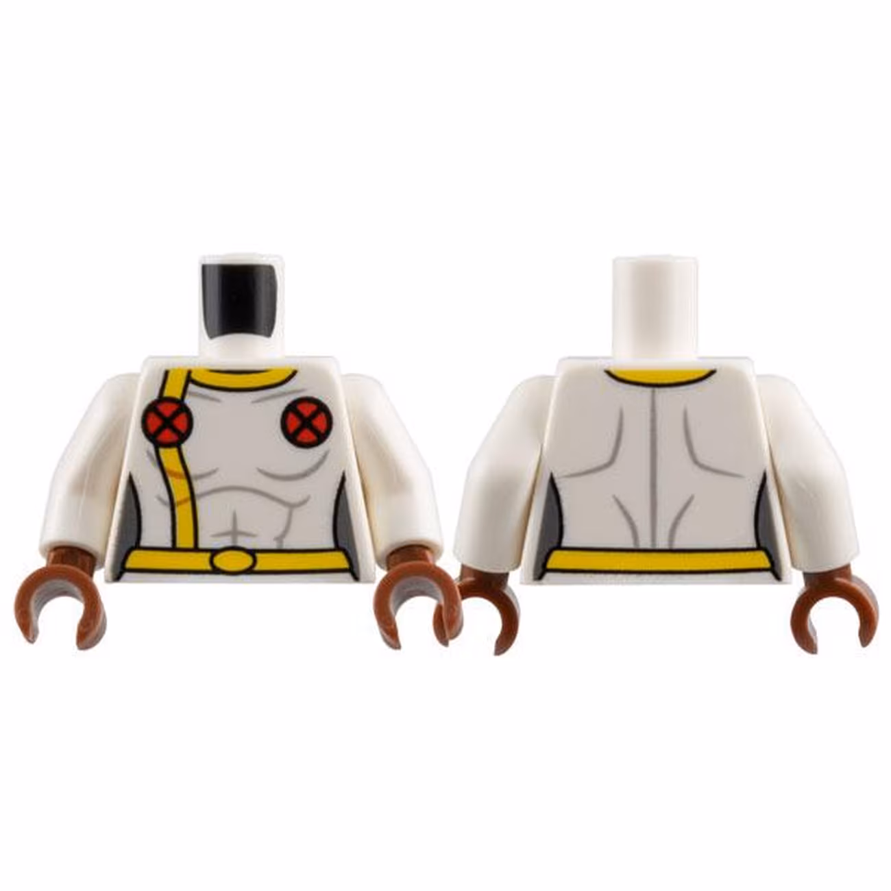 Деталь Lego 973pb5398c01 Torso Female Super Hero Costume with Yellow Collar, Stripe, and Belt, 2 Red Circles with X-Men Logo Pattern / White Arms / Reddish Brown Hands