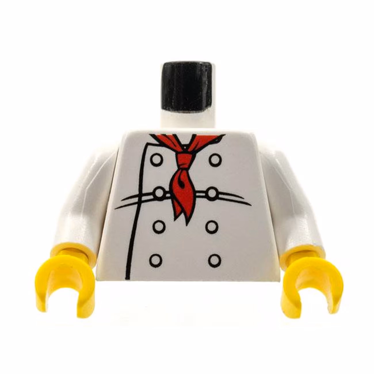 Деталь Lego 973px4c01 Torso Chef with 8 Buttons, Long Red Neckerchief, Black Wrinkles Pattern / White Arms / Yellow Hands
